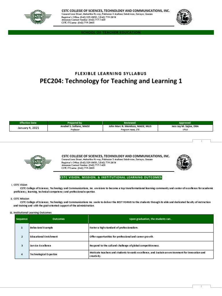 PEC 204 (Technology For Teaching and Learning 1) Course Syllabus